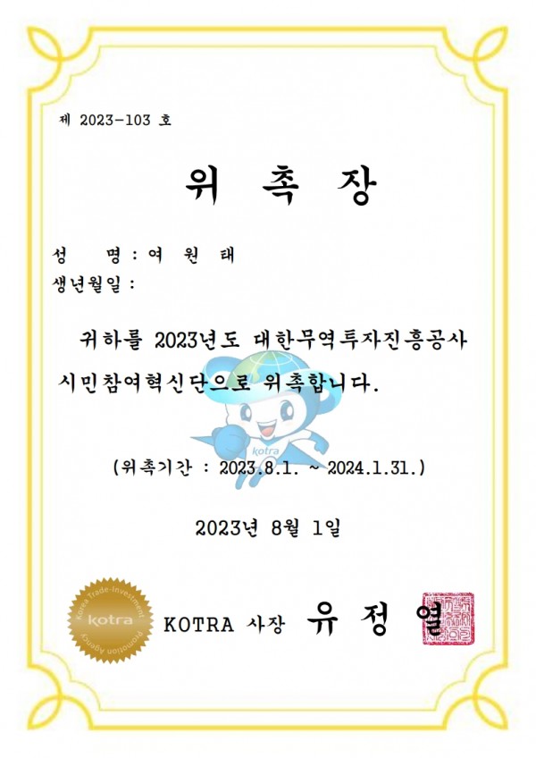 Letter of Appointment of KOTRA Citizen Participation Innovation Group 관련링크 mondereve 143 0 본문 Letter of Appointment of KOTRA Citizen Participation Innovation Group SHARE THIS PAGE 목록